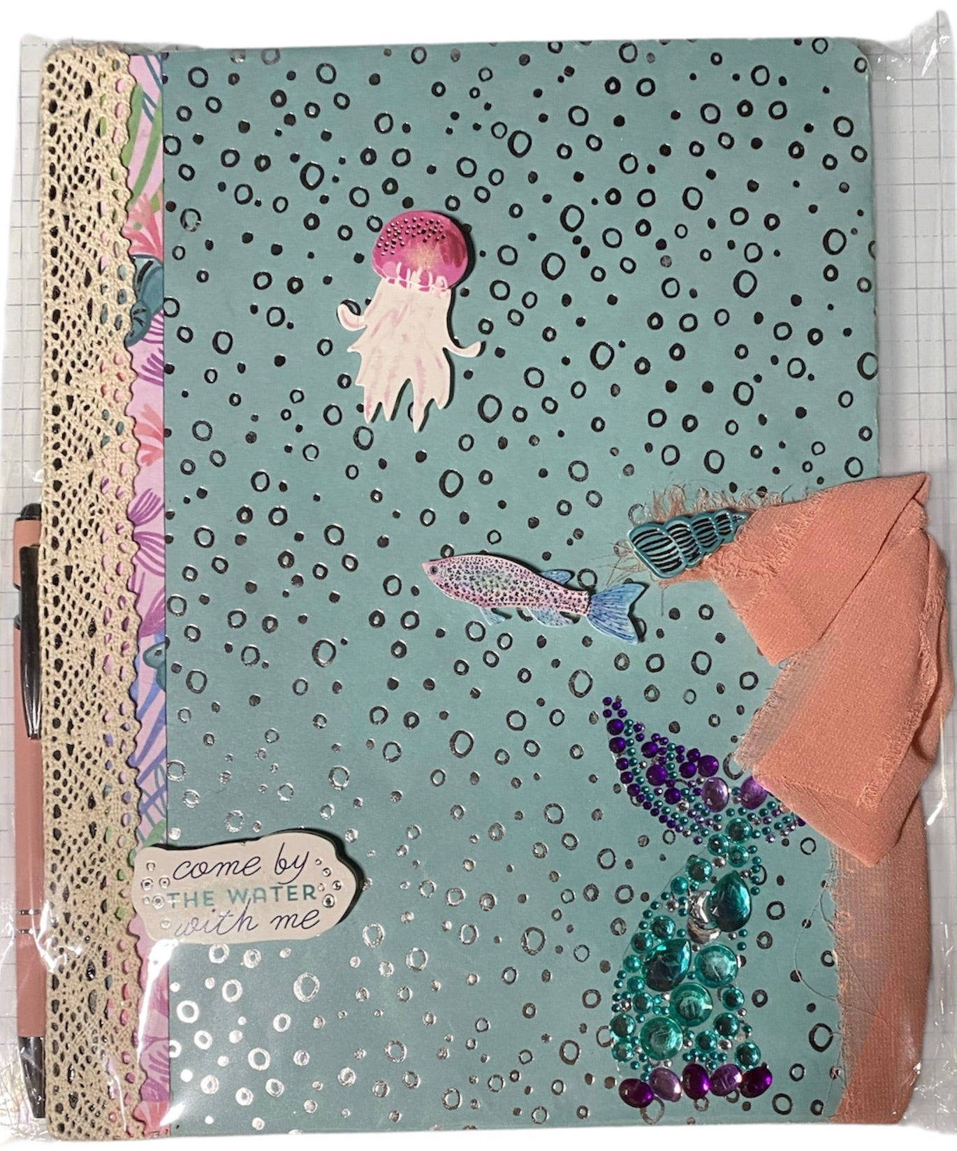 Ocean-inspired and full of whimsy, this mermaid-themed notebook features metallic bubbles, undersea creatures, and a sparkling tail made of gems. A soft pink ribbon and the phrase βCome by the water with meβ complete the magical vibe. Ideal for sea lovers and daydreamers alike.