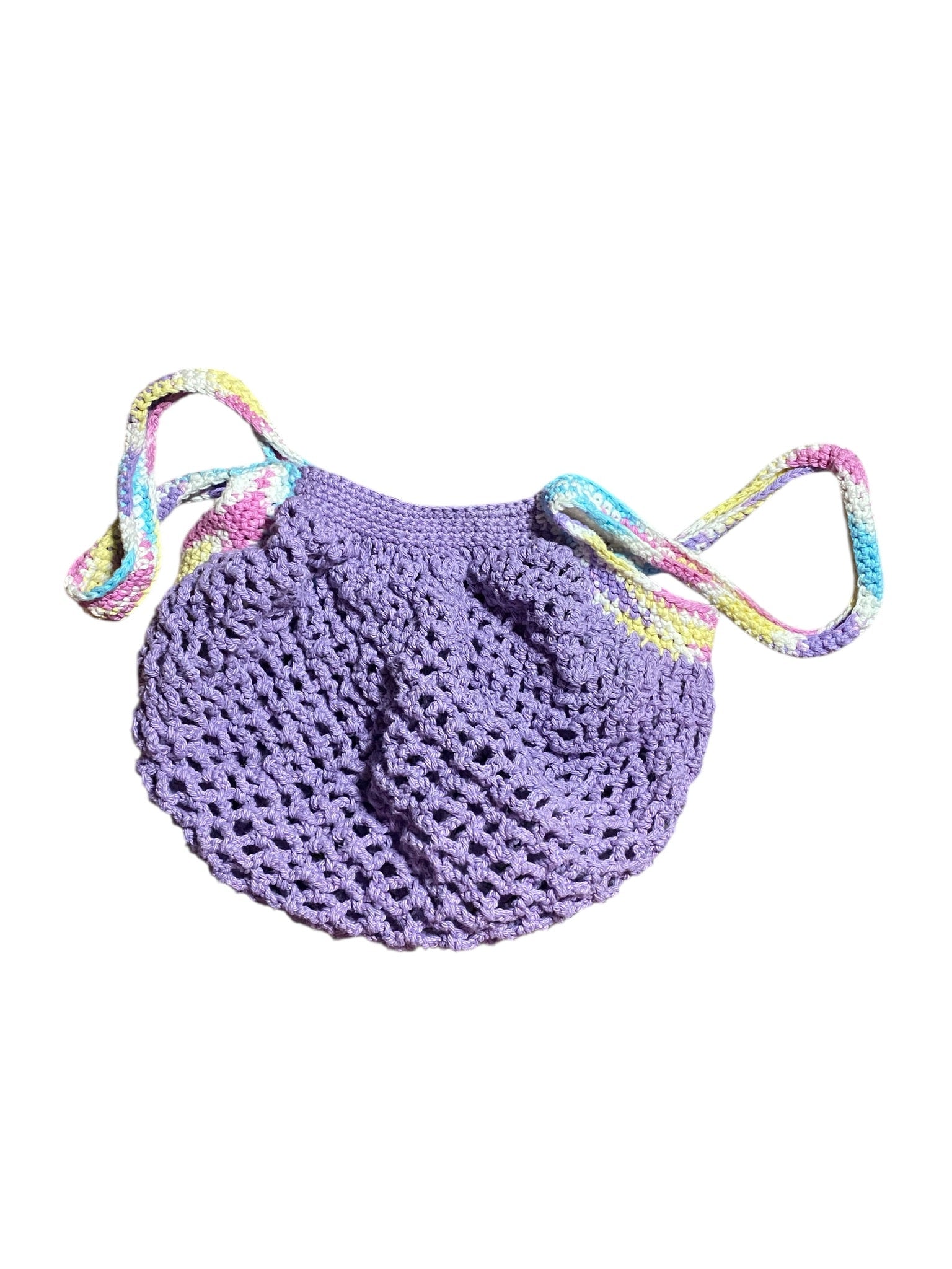 Soft lavender meets playful rainbow handles in this cheerful, roomy market tote. Whether youβre carrying produce or packing for a day out, this handmade bag adds charm and function.