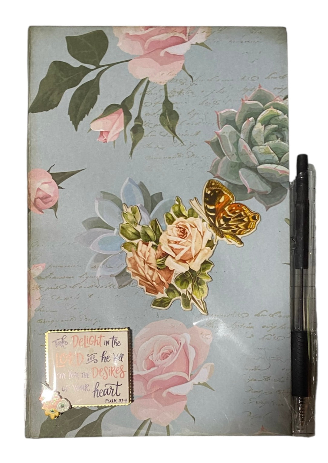 A soft blue floral background with roses, succulents, and a butterfly, paired with an inspiring Psalm 37:4 verse. A sweet and serene design perfect for daily affirmations or gratitude journaling.