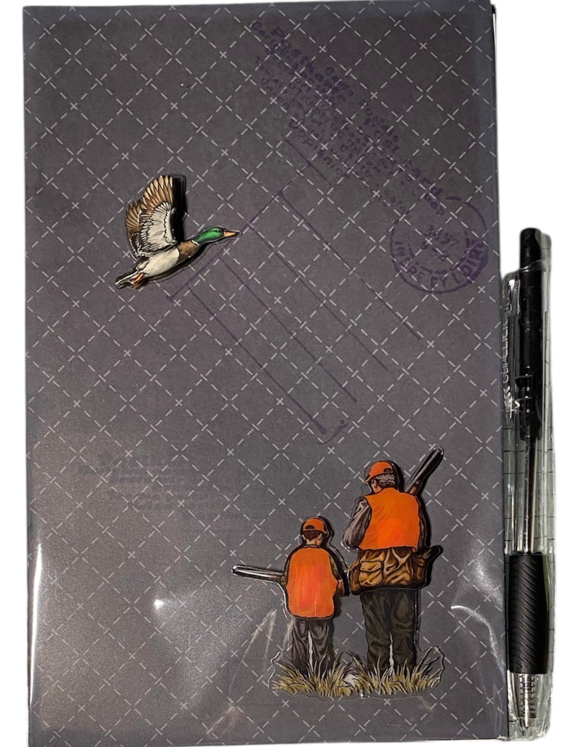 Deep gray with subtle patterning, this folio shows a hunter and child under a flying duck—perfect for the outdoorsman or father-son duo.