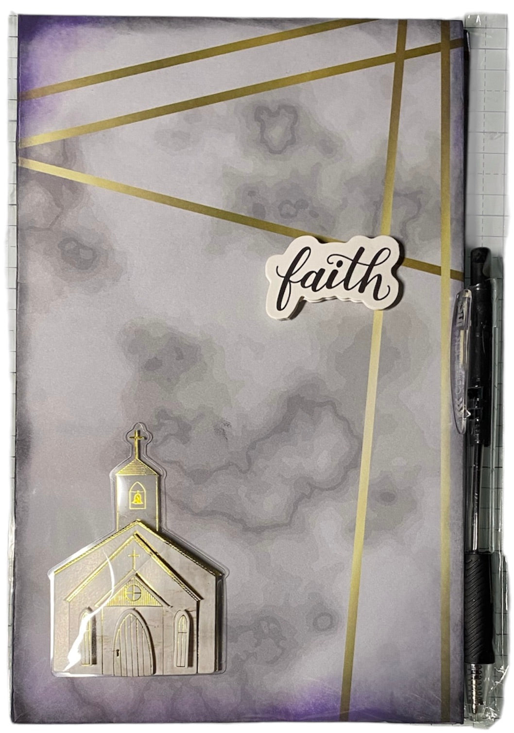 A modern mix of smoky marbled background and clean gold lines highlights a peaceful church motif and the word “faith.” Ideal for quiet reflection or sermon notes.
