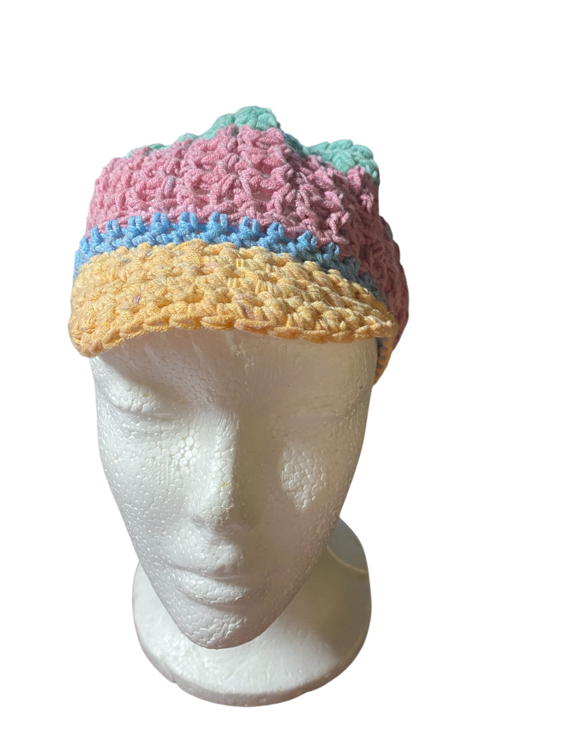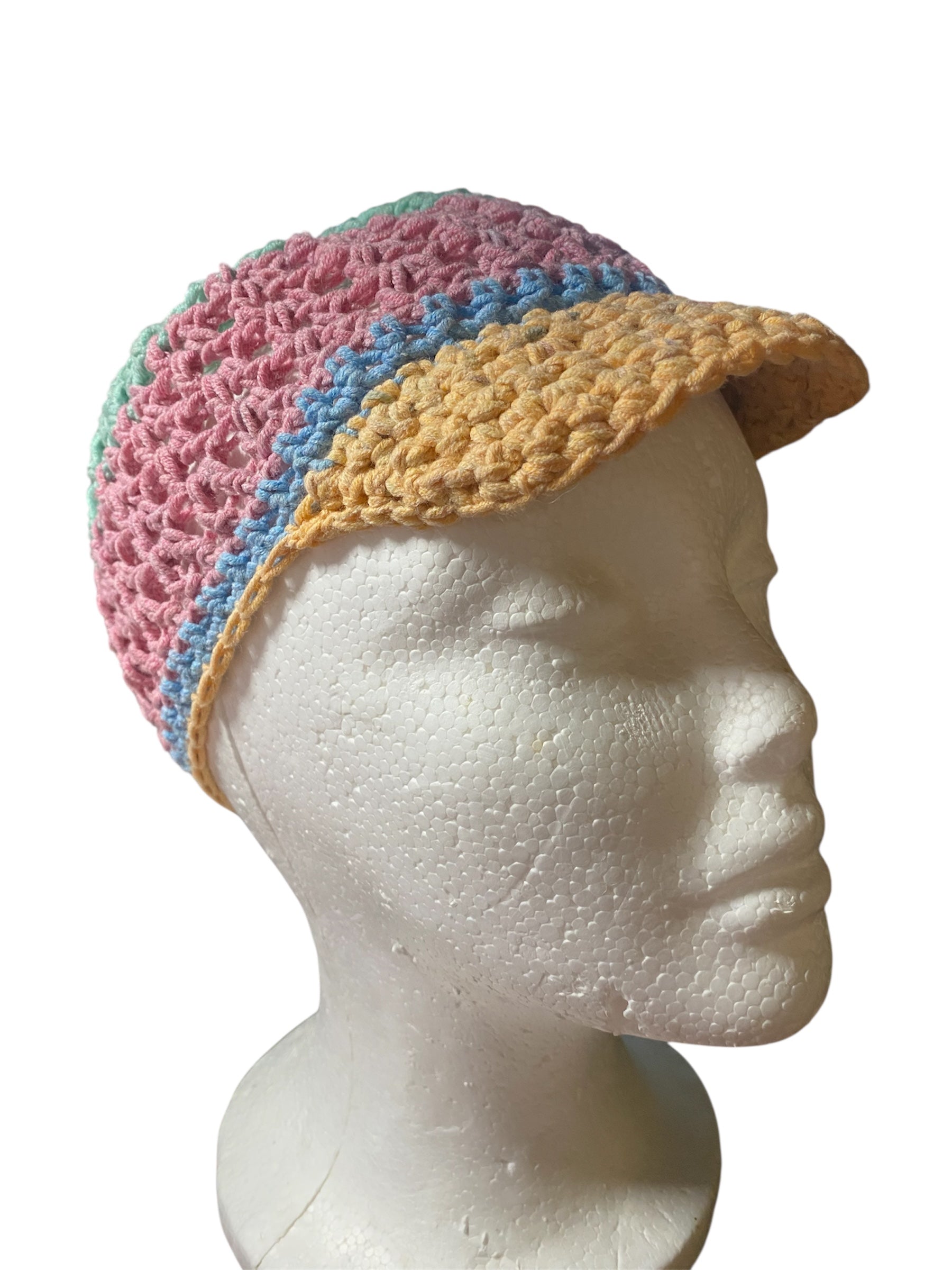 Channel vintage charm with a modern twist in our Sunshine Bloom Newsboy Cap. Hand-crocheted from breathable cotton yarn, this colorful cap features a classic newsboy silhouette with cheerful spring-inspired hues—pinks, mints, blues, and a sunny yellow brim. The lightweight, openwork design keeps you cool while adding texture and personality to any outfit.